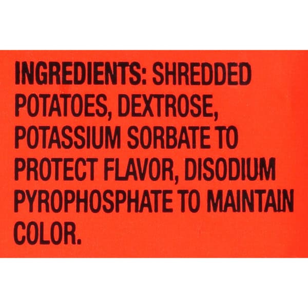 Shredded Potatoes, Dextrose, Potassium Sorbate to Protect Flavor, Disodium Pyrophosphate to Maintain Color.
