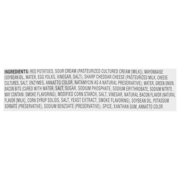Red Potatoes, Sour Cream (pasteurized Cultured Cream [milk], Enzymes), Mayonnaise (soybean Oil, Water, Egg Yolks, Vinegar, Salt), Sharp Cheddar Cheese (pasteurized Milk, Cheese Cultures, Salt, Enzymes, Annatto Color, Natamycin As A Natural Preservative), Water, Green Onion, Bacon Bits (pork, Water, Salt, Sugar, Sodium Phosphate, Sodium Erythorbate, Sodium Nitrite, May Contain Smoke Flavoring), Modified Corn Starch, Salt, Vinegar, Natural Bacon Flavor (natural Flavor [milk], Corn Syrup Solids, Salt, Yeast Extract, Natural Smoke Flavoring), Soybean Oil, Potassium Sorbate (preservative), Sodium Benzoate (preservative), Black Pepper, Xanthan Gum, Annatto Extract (color).