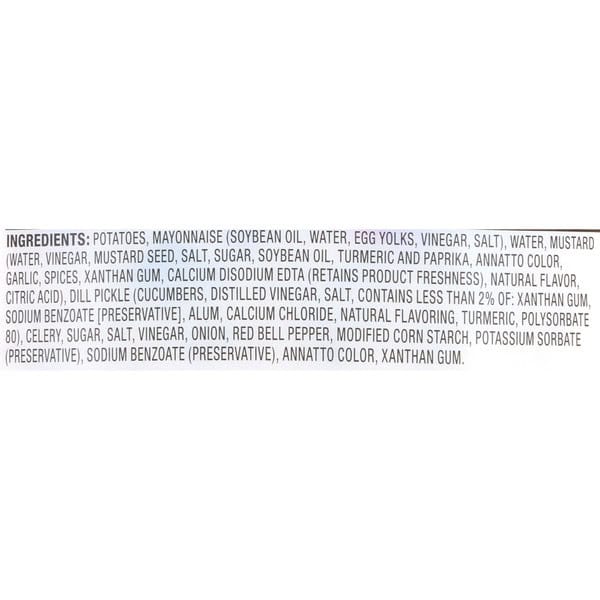 Potatoes, Mayonnaise (soybean Oil, Water, Egg Yolks, Vinegar, Salt), Water, Mustard (water, Vinegar, Mustard Seed, Salt, Sugar, Turmeric, Paprika, Garlic Powder, Spices, Xanthan Gum, Annatto Extract Color, Natural Flavor), Dill Pickle Cubes (cucumbers, Distilled Vinegar, Salt, Calcium Chloride, Natural Flavoring, Contains Less Than 2% Of: Xanthan Gum, Sodium Benzoate [preservative], Alum, Turmeric, Polysorbate 80), Celery, Sugar, Salt, Vinegar, Onion, Red Bell Pepper, Modified Corn Starch, Potassium Sorbate (preservative), Sodium Benzoate (preservative), Annatto Extract (color), Xanthan Gum.