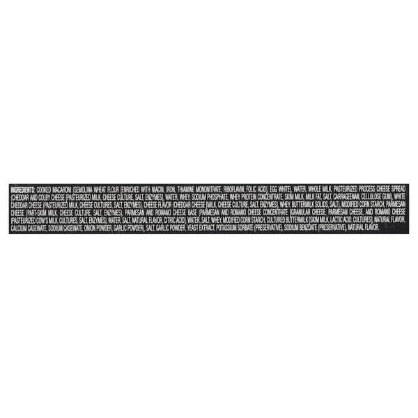 Cooked Macaroni (semolina Wheat Flour [enriched With Niacin, Iron, Thamine Monontrate, Riboflavin, Folic Acid], Egg White), Water, Whole Milk, Pasteurized Process Cheese Spread (cheddar And Colby Cheese [pasteurized Milk, Cheese Culture, Salt, Enzymes], Water, Whey, Sodium Phosphate, Whey Protein Concentrate, Skim Milk, Milk Fat, Salt, Carrageenan, Cellulosegum), White Cheddar Cheese (pasteurized Milk, Cheese Cultures, Salt, Enzymes), Cheese Flavor (cheddar Cheese [milk Cheese Culture, Salt, Enzymes], Whey,buttermilk Solids, Salt), Modiredcorn Starch, Parmesan Cheese (part-skim Milk, Cheese Culture, Salt, Enzymes), Parmesan And Romano Cheese Base (parmesan And Romano Cheese Concentrate [granular Cheese, Parmesan Cheese, And Romano Cheese {pasteurized Cow’s Milk, Cultures, Salt, Enzymes}, Water, Salt, Natural Flavor, Citric Acd], Water, Salt, Whey, Modified Corn Starch, Cultured Buttermilk [skimmilk, Lactic Acid, Cultures], Natural Flavor, Calcium Casienate, Sodium Caseinate, Onion Powder, Garlic Powder), Salt, Garlic Powder), Yeast Extract, Potassium Sorbate ( Preservative), Sodium Benzoate (preservative), Natural Flavor.