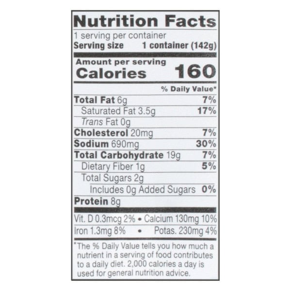 Heating Instructions: Microwave Per 1 Container: 1. Partially peel back the film lid and place in the microwave. 2. Microwave on high for 45 seconds or until hot. 3. Caution! Container will be hot so use the side panel grips to remove it from the microwave. 4. Carefully, remove the film lid and stir the contents from the bottom up. Let cool for 30 seconds. Do not heat in conventional oven, toaster oven, or broiler.