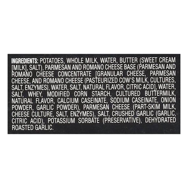 Ingredients: Potatoes, Whole Milk, Water, Parmesan And Romano Cheese Base (parmesan And Romano Cheese [milk, Culture, Enzymes, Salt], Water, Whey, Salt, Modified Corn Starch, Cultured Buttermilk Solids, Calcium And Sodium Caseinates, Natural Flavoring, And Garlic Powder), Butter (sweet Cream, Salt), Salt, Garlic Minced In Oil (garlic, Soybean Oil, Citric Acid), Potassium Sorbate To Protect Flavor, Dehydrated Roasted Garlic.