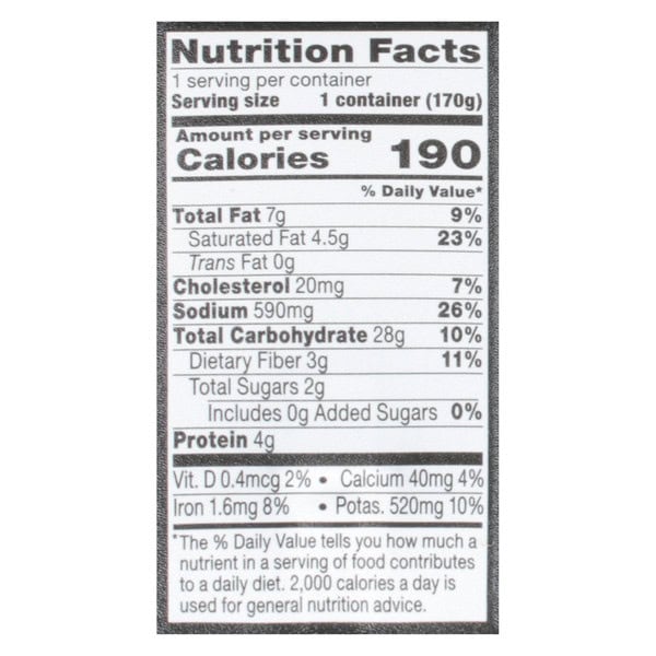 Heating instructions: Microwave: Per 1 Container. 1. Partially peel back the film lid and place in the microwave. 2. Microwave on high for 1 minute or until hot. 3. Caution! Container will be hot so use the side panel grips to remove it from the microwave. 4. Carefully, remove the film lid and stir the contents from the bottom up. Let cool for 30 seconds. Do not heat in conventional oven, toaster oven, or broiler.