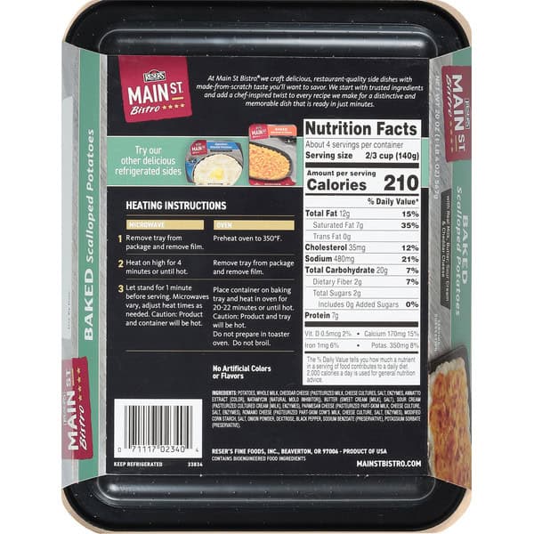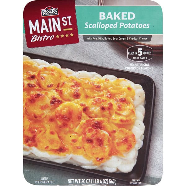 Make dinner memorable with the made-from-scratch taste of Main St Bistro Baked Scalloped Potatoes. This delicious fully baked side dish is ready in minutes so it pairs quickly and easily with your favorite entree. A rich and creamy baked casserole of tender potatoes topped with golden-brown cheddar cheese made with trusted ingredients including real milk, butter, cheddar cheese, and sour cream. Heat in the microwave or oven and get that great baked taste without all of the preparation.