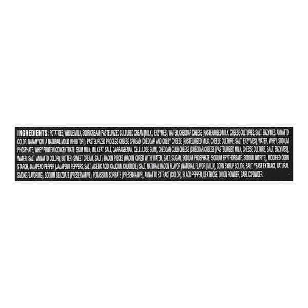 Potatoes, Whole Milk, Sour Cream (pasteurized Cultured Cream [milk], Enzymes), Water, Cheddar Cheese (pasteurized Milk, Cheese Cultures, Salt, Enzymes, Annatto Color, Natamycin [a Natural Mold Inhibitor]), Pasteurized Process Cheese Spread (cheddar And Colby Cheese [pasteurized Milk, Cheese Culture, Salt, Enzymes], Water, Whey, Sodium Phosphate, Whey Protein Concentrate, Skim Milk, Milk Fat, Salt, Carrageenan, Cellulose Gum), Cheddar Club Cheese (cheddar Cheese [pasteurized Milk, Cheese Culture, Salt, Enzymes], Water, Salt, Annatto Color), Butter (sweet Cream, Salt), Bacon Pieces (bacon Cured With Water, Salt, Sugar, Sodium Phosphate, Sodium Erythorbate, Sodium Nitrite), Modified Corn Starch, Jalapeno Pepper (jalapeno Peppers, Salt, Acetic Acid, Calcium Chloride), Salt, Natural Bacon Flavor (natural Flavor [milk], Corn Syrup Solids, Salt, Yeast Extract, Natural Smoke Flavoring), Sodium Benzoate (preservative), Potassium Sorbate (preservative), Annatto Extract (color), Black Pepper, Dextrose, Onion Powder, Garlic Powder.