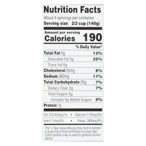 Heating Instructions: Microwave: 1. Remove tray from package and remove film. 2. Heat on high for 4 minutes or until hot. 3. Let stand for 1 minute before serving. Microwaves vary, adjust heat times as need. Caution: Product and container will be hot. Oven: 1. Preheat oven to 350 degrees F. 2. Remove tray from package and remove film. 3. Place container on baking tray and heat in oven for 20-22 minutes or until hot. Caution: Product and tray will be hot. Do not prepare in toaster oven. Do not broil.