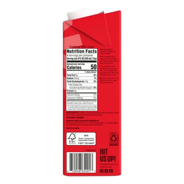 • One (1) 32 fl oz carton of Revl Fruits ™ Boldly Cran™ Cranberry Juice, 100% Juice