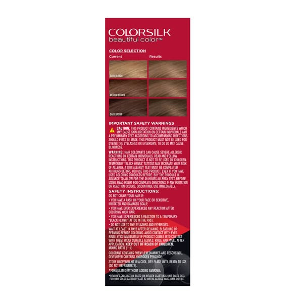 Caution: This product contains ingredients which may cause skin irritation on certain individuals and a preliminary test according to accompanying directions should first be made. This product must not be used for dyeing the eyelashes or eyebrows; to do so may blindness., Important Safety Warnings. Warning: Hair colorants can cause severe allergic reactions on certain individuals. Read and follow instructions. This product is not to be used on children. Temporary black henna tattoos may increase your risk of allergy. A skin allergy test must be completed 48 hours before you use this product, even if you have used coloring products before. Buy the product in advance to allow for the 48 hours allergy test. Before using, read insert for complete directions. If any irritation or reaction occurs. discontinue use immediately. Safety Instructions: Do not color your hair if: you have a rash on your face or sensitive, irritated and damaged scalp, you have ever experienced any reaction after coloring your hair, you have experienced a reaction to a temporary black henna tattoo in the past. Do not use to dye eyelashes and eyebrows. Wait at least 14 days after relaxing, bleaching or perming before coloring. Avoid contact with eyes. Rinse eyes immediately if product comes into contact with them. Wear suitable gloves. Rinse hair well after application. Keep out of reach of children. Mixing ratio (1:1). Colorant contains phenylenediamines and resorcinol. Developer contains hydrogen peroxide.