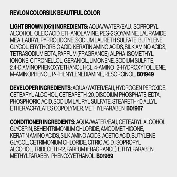 Ammonia Free Colorant Ingredients Aqua/water, Isopropyl Alcohol, Oleic Acid, Ethanolamine, Peg-2 Soyamine, Lauramide Mea, Lauryl Pyrrolidone, Sodium Laureth Sulfate, Butylene Glycol, Erythorbic Acid, Keratin Amino Acids, Silk Amino Acids, Tetrasodium Edta, Fragrance, Alpha-isomethyl Ionone, Citronellol, Geraniol, Limonene, Sodium Sulfite, 2, 4-diaminophenoxyethanol Hcl, 4-amino-2-hydroxytoluene, M-aminophenol, P-phenylenediamine, Resorcinol, Creme Developer Ingredients: Aqua/water, Hydrogen Peroxide, Cetearyl Alcohol, Ceteareth-20, Disodium Phosphate, Edta, Phosphoric Acid, Sodium Lauryl Sulfate, Steareth-10 Allyl Ether/acrylates Copolymer, Methylparaben, After-color Conditioner Ingredients: Aqua/water, Cetearyl Alcohol, Glycerin, Behentrimonium Chloride, Amodimethicone, Keratin Amino Acids, Silk Amino Acids, Acetic Acid, Butylene Glycol, Cetrimonium Chloride, Citric Acid, Isopropyl Alcohol, Trideceth-12, Fragrance, Ethylparaben, Methylparaben, Phenoxyethanol
