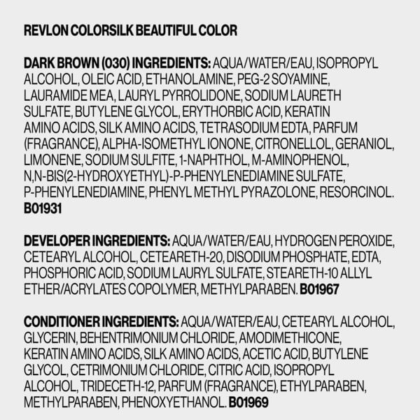 Ammonia-free Colorant Ingredients: Aqua/water, Isopropyl Alcohol, Oleic Acid, Ethanolamine, Peg-2 Soyamine, Lauramide Mea, Lauryl Pyrrolidone, Sodium Laureth Sulfate, Butylene Glycol, Erythorbic Acid, Keratin Amino Acids, Silk Amino Acids, Tetrasodium Edta, Fragrance, Alpha-isomethylionone, Citronellol, Geraniol, Limonene, Sodium Sulfite, 1-naphthol, M-aminophenol, N,n-bis(2-hydroxyethyl) P-phenylenediamine Sulfate, P-phenylenediamine, Phenyl Methyl Pyrazolone, Resorcinol, Creme Developer Ingredients: Aqua/water, Hydrogen Peroxide, Cetearyl Alcohol, Ceteareth-20, Disodium Phosphate, Edta, Phosphoric Acid, Sodium Lauryl Sulfate, Steareth-10 Allyl Ether/acrylates Copolymer, Methylparaben, After-color Conditioner Ingredients: Aqua/water, Cetearyl Alcohol, Glycerin, Behentrimonium Chloride, Amodimethicone, Keratin Amino Acids, Silk Amino Acids, Acetic Acid, Butylene Glycol, Cetrimonium Chloride, Citric Acid, Isopropyl Alcohol, Trideceth-12, Fragrance, Ethylparaben, Methylparaben, Phenoxyethanol