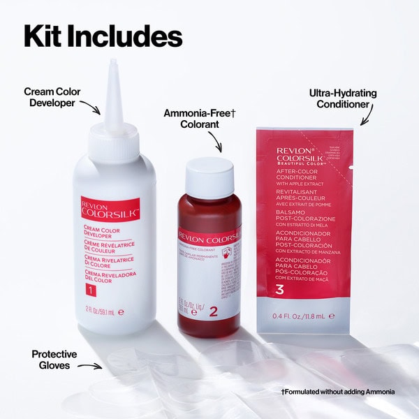 New, no mess, non-drip formula for easy to use at-home color application. The same great ColorSilk Hair Color loved by women now made even better with new trend shades and a new formula! ColorSilk Beautiful Colorâ„¢ is the #1 hair color in the USA*. The ammonia-free hair color delivers 100% gray coverage and salon-quality color and shine. Achieve rich, long lasting hair color at home! Hair is left silky, shiny, healthy and in better condition than before you colored it after each box. Revlon’s 3D Color Gel Technologyâ„¢ delivers natural looking, multi-tonal color from root to tip providing definition and boosting your hair’s dimension. *Revlon’s calculations based on NielsenIQ ScanTrack Service for the Women’s Hair Color category for the 52 weeks ending 1/1/22 period, the Total US Market, xAOC. Copyright ©Nielsen Consumer LLC +Formulated without adding Ammonia