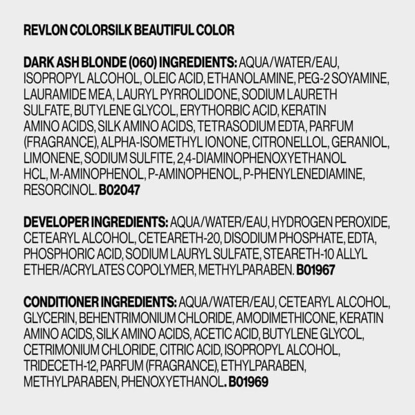 Ammonia-free Colorant Ingredients: Aqua/water, Isopropyl Alcohol, Oleic Acid, Ethanolamine, Peg-2 Soyamine, Lauramide Mea, Lauryl Pyrrolidone, Sodium Laureth Sulfate, Butylene Glycol, Erythorbic Acid, Keratin Amino Acids, Silk Amino Acids, Tetrasodium Edta, Fragrance, Alpha-isomethyl Ionone, Citronellol, Geraniol, Limonene, Sodium Sulfite, 2,4 Diaminophenoxyethanol Hcl, M-aminophenol, P-aminophenol, P-phenylenediamine, Resorcinol, Cream Developer Ingredients: Aqua/water, Hydrogen Peroxide, Cetearyl Alcohol, Ceteareth-20, Disodium Phosphate, Edta, Phosphoric Acid, Sodium Lauryl Sulfate, Steareth-10 Allyl Ether/acrylates Copolymer, Methylparaben, After-color Conditioner Ingredients: Aqua/water: Cetearyl Alcohol, Glycerin, Behentrimonium Chloride, Amodimethicone, Keratin Amino Acids, Silk Amino Acids, Acetic Acid, Butylene Glycol, Cetrimonium Chloride, Citric Acid, Isopropyl Alcohol, Trideceth-12, Fragrance, Ethylparaben, Methylparaben, Phenoxyethanol