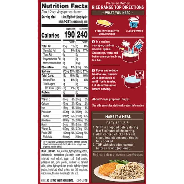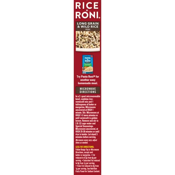 In a 2- quart microwaveable bowl, combine rice- vermicelli mix and 1 tablespoons of butter or margarine. Microwave uncovered at high 1 minute. Stir. Microwave at high 1-2 more minutes or until vermicelli is golden brown. Remove and stir in 2 & 1/2 cups water and special seasonings. Microwave uncovered, at high 25-28 minutes or until rice is tender. Let stand 3 minutes before serving. Microwave ovens vary: adjust times as needed. Less Fat Directions: Follow range top or microwave directions, except omit butter or margarine. Fat reduced to 0.5 g from 6 g per serving. Saturated fat reduced to 0 g from 1 g per serving. Trans fat reduced to 0 g from 1 g per serving. See nutrition facts panel for sodium content. Preferred Method Rice Range Top Directions: What You Need: 1 tablespoon butter or margarine. 1-2/3 cups water. 1. In a medium saucepan, combine rice mix, special seasonings, water and butter or margarine; bring to a boil. 2. Cover and reduce heat to low. Simmer 25 to 30 minutes or until rice is tender. Let stand 3 minutes before serving. About 2 cups prepared. Enjoy! See side panels for additional product information.