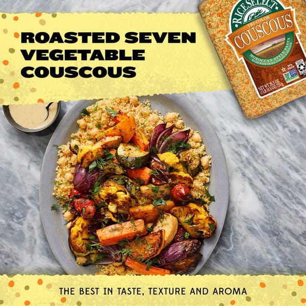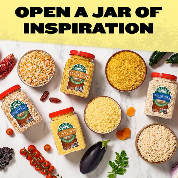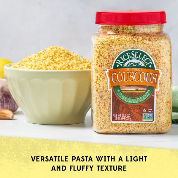 • Unlock layers of culinary creativity with RiceSelect Tri-Color Couscous; once it’s ready, add your favorite pasta sauce or use it for hearty soups, salads, or as a delicious bed for your favorite protein!