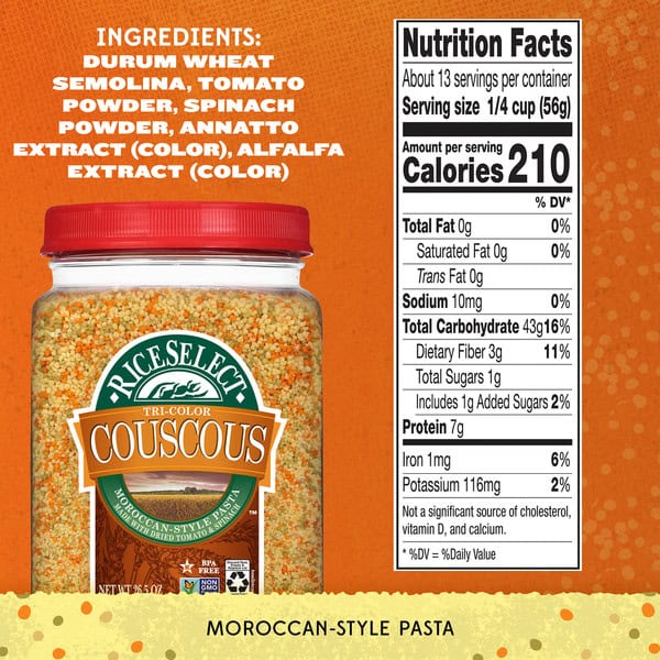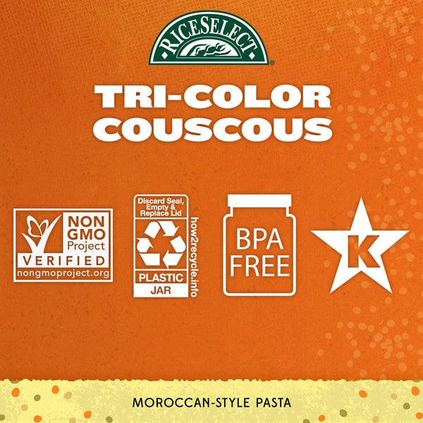 • Our tri-color couscous is packaged in a recyclable and reusable, BPA-free jar to enforce environmental sustainability; it’s also Non-GMO Project verified, certified kosher, and contains no preservatives