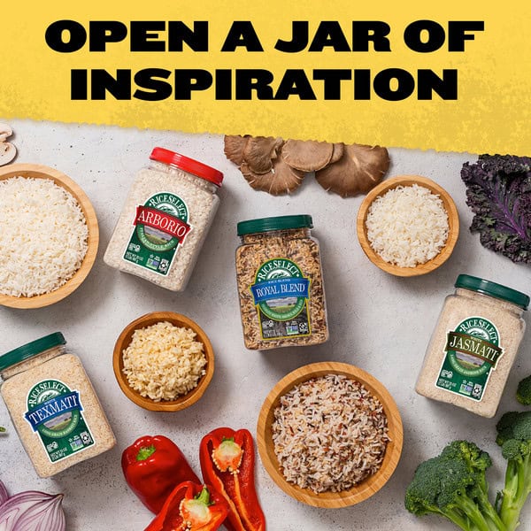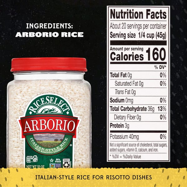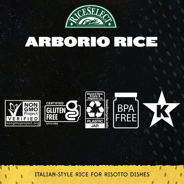 Bring your spontaneous brilliance to the kitchen and create an unforgettable meal with RiceSelect Arborio Rice! This bold, medium-grain rice is high in starch, giving its signature creamy, silky texture and al dente (chewy & sticky) bite with a cook time of 15 minutes. With its exceptional ability to absorb flavors and quick cook time, this versatile grain tastes great in indulgent risottos, seasonal arancini appetizers, or rich rice puddings, like our unforgettable Seafood Risotto or Pumpkin Sage Arancini. Arborio rice is low in fat, cholesterol free, has no additives or preservatives, and is suitable for vegans and vegetarians. For your convenience, our RiceSelect Arborio Rice is Non-GMO Project Verified, Certified Gluten-Free, Certified Kosher by Star K, and packaged in a 32-oz 100% recyclable, BPA-free jar.
