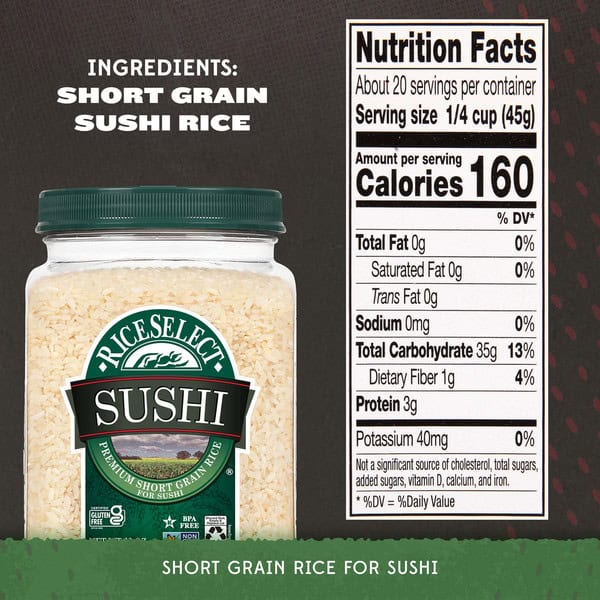 Bring your spontaneous brilliance to the kitchen and create an unforgettable meal with RiceSelect Sushi Rice! RiceSelect Sushi Rice is designed for a home cook as thoughtful and discerning as you. Having been perfected for over 2,000 years for a taste that is comparable to those found in Japan, RiceSelect Sushi Rice offers incredible quality. Uniquely crafted with two varieties of Sushi Rice, including Koshihikari and Calihikari, this premium short-grain rice sets the standard for sushi rice sold in the United States. In addition to its pristine appearance, appetizing aroma and quick cook time of 15 minutes, Sushi Rice has a sweet flavor and soft, sticky texture. Sushi rice is low in fat, cholesterol free, has no additives or preservatives, and is suitable for vegans and vegetarians. For your convenience, our RiceSelect Sushi Rice is Non-GMO Project Verified, Certified Gluten-Free, Certified Kosher by Star K, and packaged in a 32-oz 100% recyclable, BPA-Free jar.