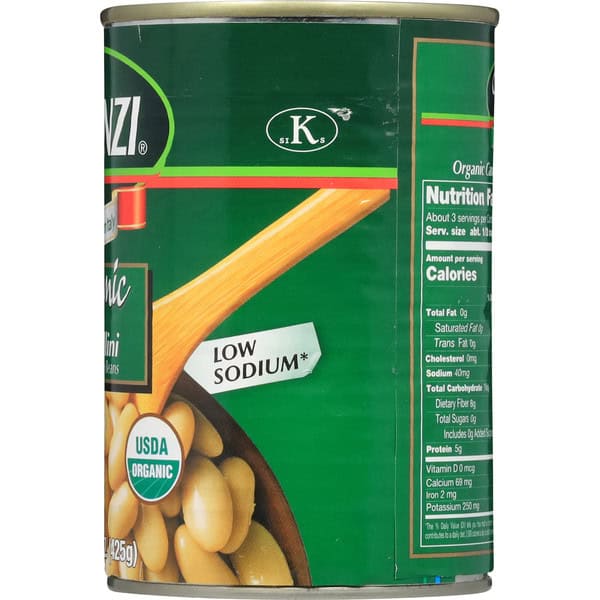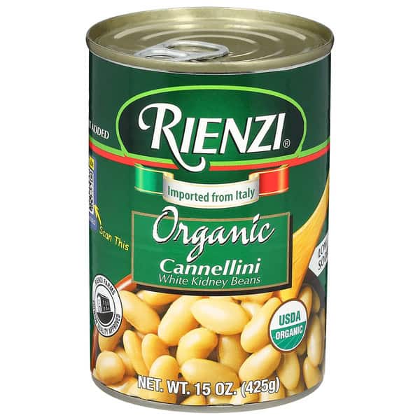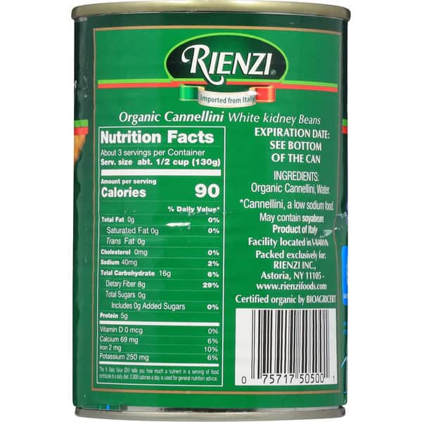 USDA Organic. Certifed Organic by Icea. Low sodium (Cannellini, a low sodium food). No salt added. Rienzi Farms. Premium quality approved. 50th Celebrating anniversary. www.rienzifoods.com. Imported from Italy. Imported from Italy. Product of Italy.