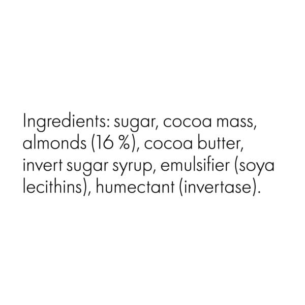 sugar, cocoa mass, almonds, cocoa butter, invert sugar syrup, emulsifier (soya lecithins), humectant (invertase)