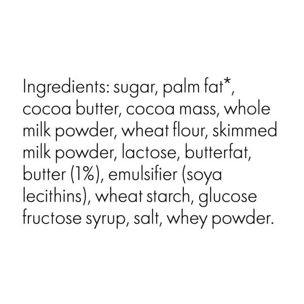 sugar, palm fat, cocoa butter, cocoa mass, whole milk powder, wheat flour, skimmed milk powder, lactose, butterfat, butter, emulsifier (soya lecithins), wheat starch, glucose fructose syrup, salt, whey powder