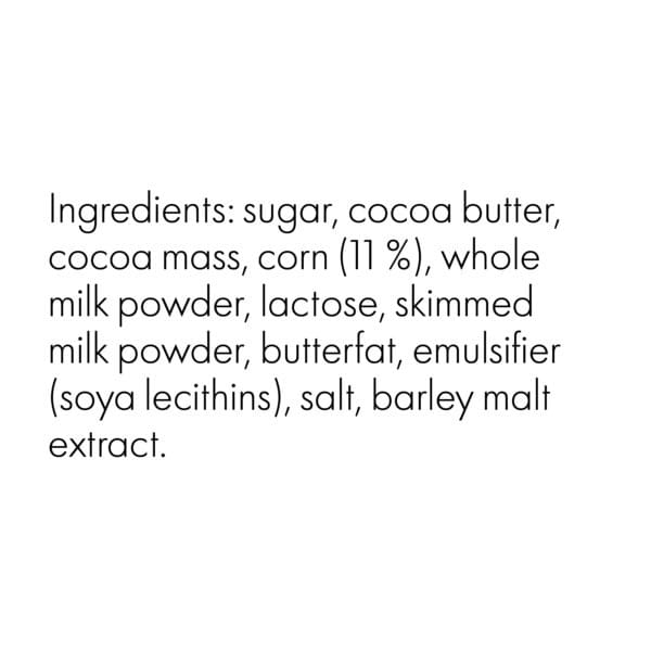 sugar, cocoa butter, cocoa mass, corn, whole milk powder, lactose, skimmed milk powder, butterfat, emulsifier (soya lecithins), salt, barley malt extract