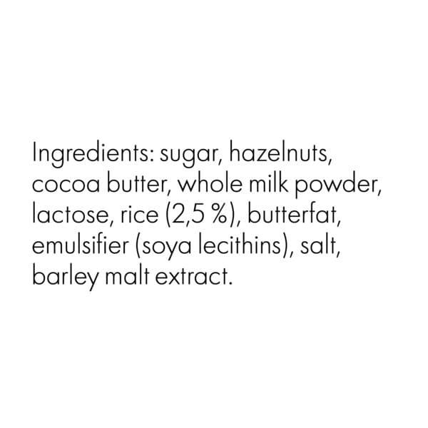 sugar, hazelnuts, cocoa butter, whole milk powder, lactose, rice, butterfat, emulsifier (soya lecithins), salt, barley malt extract