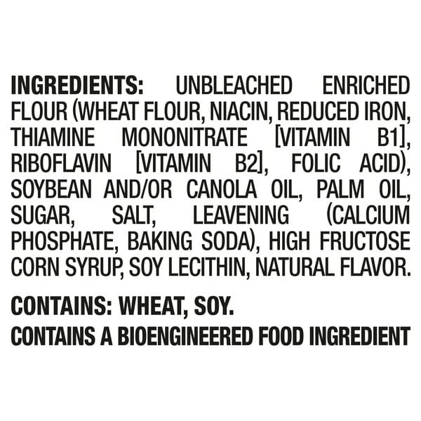 Unbleached, Enriched, Flour (wheat Flour, Niacin, Reduced Iron, Thiamine Mononitrate [vitamin B1], Riboflavin [vitamin B2], Folic Acid), Soybean And/or Canola Oil, Palm Oil, Sugar, Salt, Leavening, Calcium Phosphate, Baking Soda, High Fructose Corn Syrup, Soy Lecithin, Natural Flavor