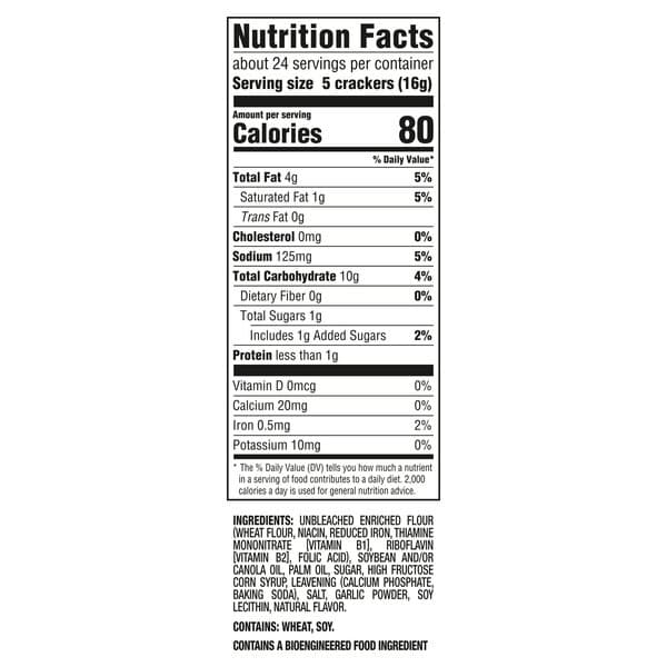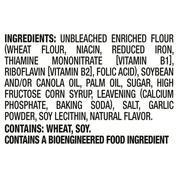 Unbleached Enriched Flour (wheat Flour, Niacin, Reduced Iron, Thiamine Mononitrate {vitamin B1}, Riboflavin {vitamin B2}, Folic Acid), Canola Oil, Palm Oil, Sugar, High Fructose Corn Syrup, Leavening (calcium Phosphate And/or Baking Soda), Salt, Garlic Powder, Soy Lecithin, Natural Flavor.