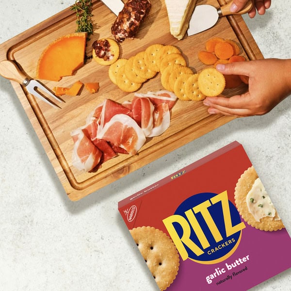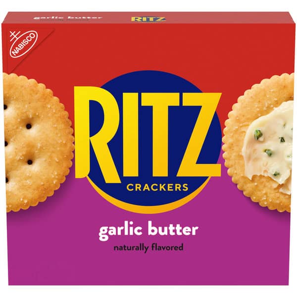 RITZ Garlic Butter crackers are the same flaky and delicious RITZ recipe you love, baked with a garlic butter flavor. RITZ traditional round crackers are a twist on the classic RITZ cracker, with a garlic butter taste that pairs well with almost any topping. RITZ Garlic Butter Crackers are delicious all on their own too, so keep these kosher dairy snacks on your shelf of salty snacks for an easy anytime treat.