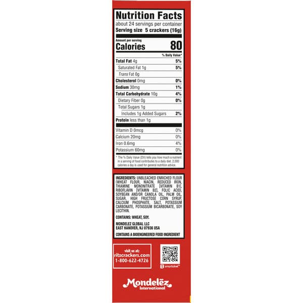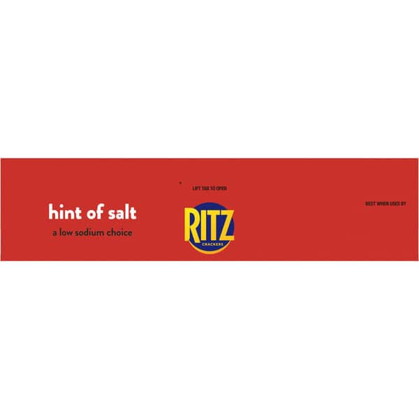 RITZ Hint of Salt Crackers are the same flaky and delicious RITZ recipe you love, with only a hint of salt. Each serving of five round crackers contains only 25 milligrams of sodium. RITZ low sodium crackers have a classic taste that pairs well with almost any topping, and they also make a great snack food on their own. Each box includes one 13.7 ounce package of RITZ snack crackers.