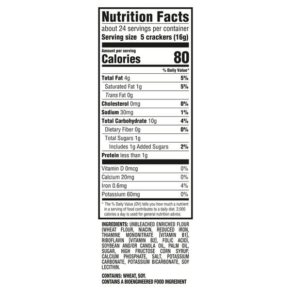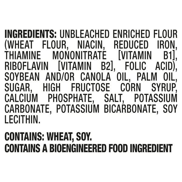 Unbleached Enriched Flour (wheat Flour, Niacin, Reduced Iron Thiamine Mononitrate [vitamin B1], Riboflavin [vitamin B2], Folic Acid), Soybean And/or Canola Oil, Palm Oil, Sugar, High Fructose Corn Syrup, Calcium Phosphate, Salt, Potassium Carbonate, Potassium Bicarbonate, Soy Lecithin.
