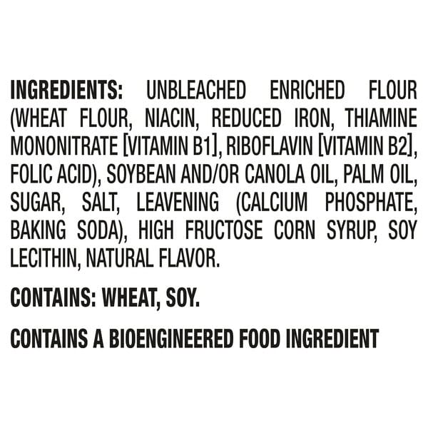 Unbleached Enriched Flour (wheat Flour, Niacin, Reduced Iron, Thiamine Mononitrate [vitamin B1], Riboflavin [vitamin B2], Folic Acid), Soybean And/or Canola Oil, Palm Oil, Sugar, Salt, Leavening (calcium Phosphate, Baking Soda), High Fructose Corn Syrup, Soy Lecithin, Natural Flavor.