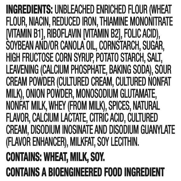 Unbleached Enriched Flour (wheat Flour, Niacin, Reduced Iron, Thiamine Mononitrate (vitamin B1], Riboflavin [vitamin B2], Folic Acid). Soybean And/or Canola Oil, Cornstarch, Sugar, High Fructose Corn Syrup, Potato Starch, Salt, Leavening (calcium Phosphate, Baking Soda), Sour Cream Powder (cultured Cream, Cultured Nonfat Milk), Onion Powder, Monosodium Glutamate, Nonfat Milk, Whey (from Milk), Spices, Natural Flavor, Calcium Lactate, Citric Acid, Cultured Cream, Disodium Inosinate And Disodium Guanylat (flavor Enhancer), Milkfat, Soy Lecithin.