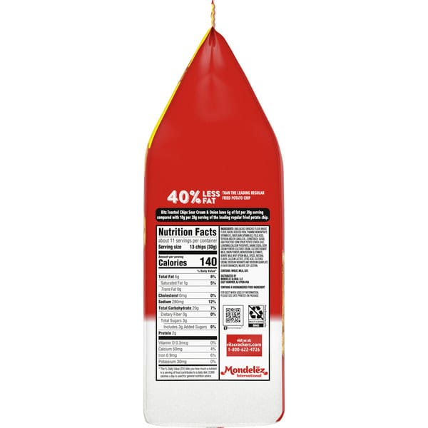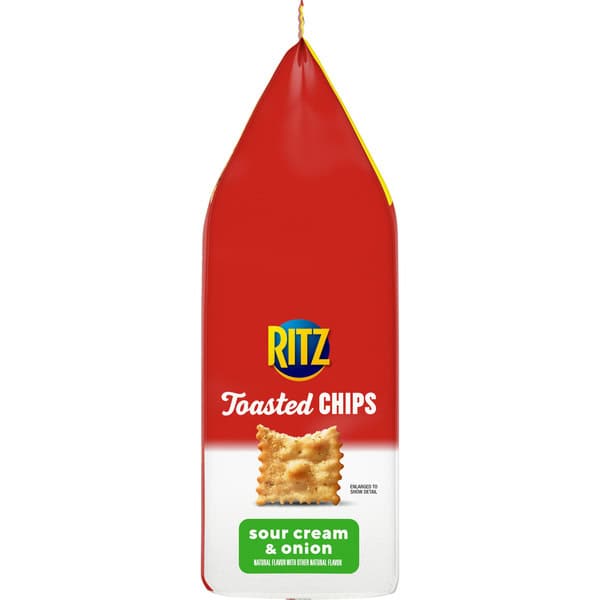 RITZ Toasted Chips Sour Cream and Onion Crackers are a crispy, crunchy twist on the classic RITZ cracker you know and love. An alternative to traditional sour cream and onion potato chips, these oven baked sour cream and onion chips are toasted, not fried, so they contain 40 percent less fat per serving than the leading fried potato chips. Pack these crackers in lunchboxes for a crunchy companion to sandwiches or add them to your snack food shelf as a tasty after school treat. Great with dips, serve RITZ Chips at your next holiday party or game night.