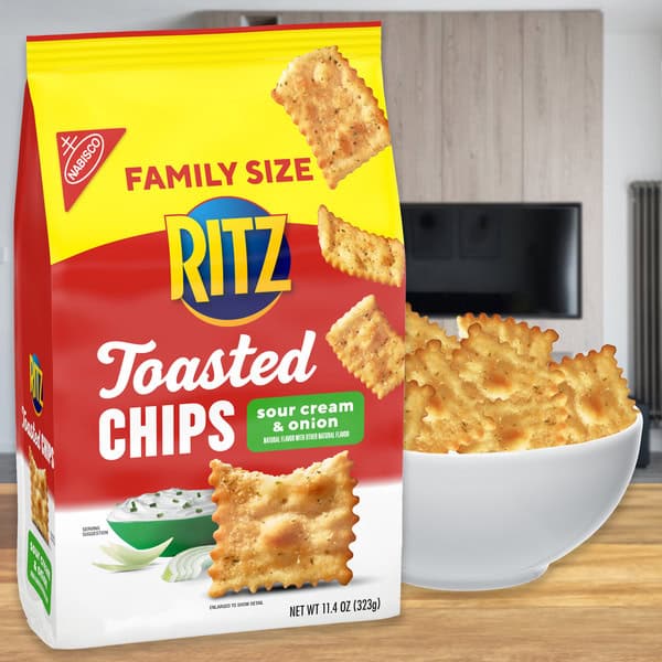 • One 11.4 oz family size bag of RITZ Sour Cream and Onion Toasted Chips (packaging may vary).