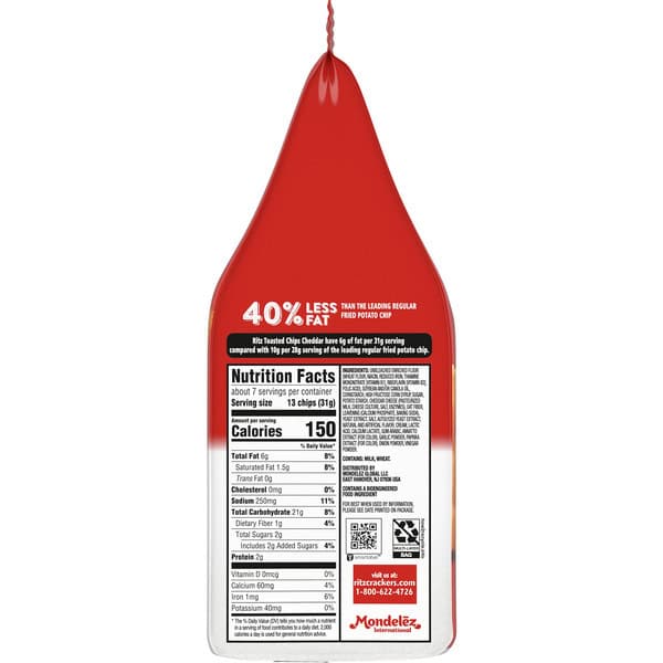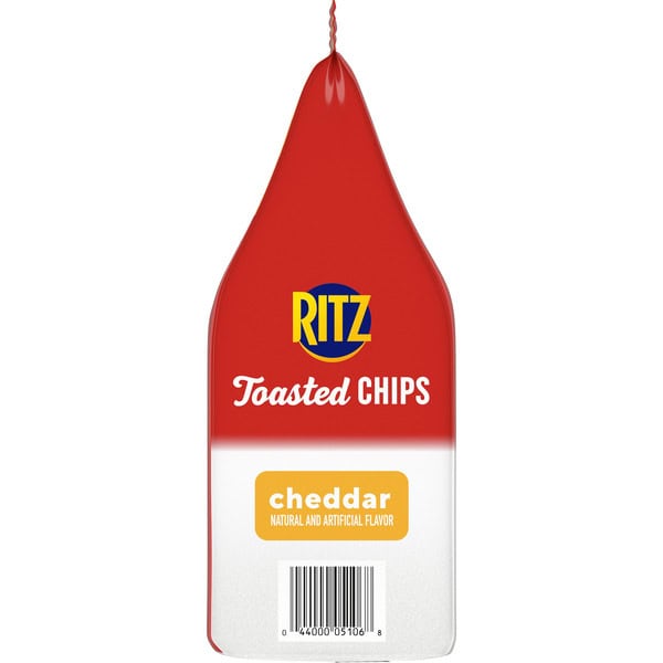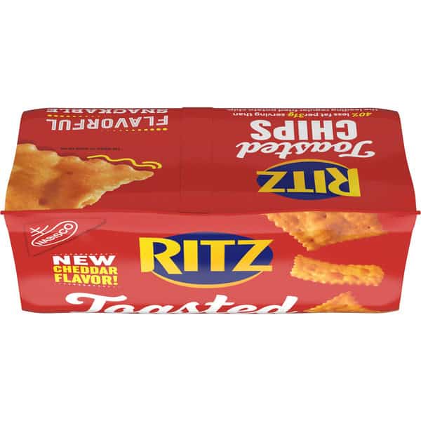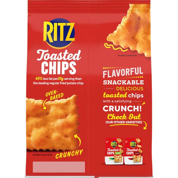 RITZ Toasted Chips Cheddar Crackers are a crispy, cheesy, crunchy twist on the classic RITZ cracker you know and love. An alternative to traditional potato chips, these oven baked chips are toasted, not fried, so they contain 40 percent less fat per serving than the leading fried potato chips. Pack these cheese crackers in lunchboxes for a crunchy companion to sandwiches or add them to your snack food shelf as a tasty after school treat. Great with dips, serve RITZ Chips at your next holiday party or game night.