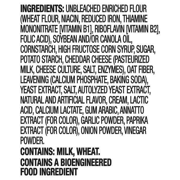 Unbleached Enriched Flour (wheat Flour, Niacin, Reduced Iron, Thiamine Mononitrate [vitamin B1], Riboflavin [vitamin B2], Folic Acid), Soybean And/or Canola Oil, Cornstarch, Sugar, High Fructose Corn Syrup, Potato Starch, Salt, Leavening (calcium Phosphate, Baking Soda), Whey (from Milk), Cheddar Cheese Powder (milk, Cheese Cultures, Salt, Enzymes), Whey Protein Concentrate, Buttermilk, Lactose, Monosodium Glutamate, Sour Cream Powder (cream, Nonfat Milk, Cultures), Natural And Artificial Flavor (contains Celery), Annatto Extract (for Color), Yellow 5 Lake, Yellow 6 Lake.