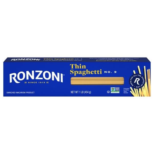 Ronzoni Thin Spaghetti is the in-the-middle pasta for those seeking an option thicker than Angel Hair yet thinner than Spaghetti. Thin spaghetti is the perfect width to thicken tangy stir fry, creamy shrimp dishes, or light oil sauces. You can also break it up to add texture to brothy soups. Each 16 oz box contains up to eight servings so you can share your favorite pasta dish with more than a few of your favorite people. A delicious foundation to wholesome meals, Ronzoni pasta is low fat, sodium- and cholesterol-free, vegetarian, non-GMO, and made with no artificial colors or preservatives. So, dish up delicious. Serve up scrumptious. Create your next five-star recipe. With Ronzoni, you can discover and re-discover your favorite pasta. Ronzoni pasta is full of possibilities.