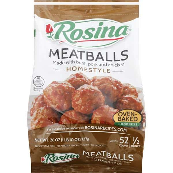 Made with beef, pork and chicken. Approx. 52 count. 1/2 ounce. Microwaveable. Fully cooked. Oven baked goodness. There’s nothing more Italian than meatballs, pasta, and enjoying them with family. For more than 50 years, that’s been at the heart of the Rosin brand. A family owned company honoring at Italian family tradition to bring your family real Italian goodness. Oven baked goodness Homestyle Meatballs. Thanks to our homemade recipe, Rosina Homestyle meatballs are great-tasting and the perfect meal to serve and enjoy with family and friends. Made with quality ingredients and no preservatives, Rosina meatballs are oven-baked for a smart choice, then sear-sealed to lock in taste. They’re quick, convenient, and easy to prepare and serve for lunch, dinner or at your next party for your family and friends to enjoy! Preservative free. U.S. inspected and passed by Department of Agriculture. www.rosina.com. Facebook. Instagram. Twitter. Pinterest. Youtube. Questions: Contact us at www.rosina.com or email your request to cservice(at)rosina.com or call 1.888.767.461. For more delicious, easy-to-prepare recipes at rosinarecipes.com. Also try our full line of Celentano fresh frozen pasta. Product of USA.