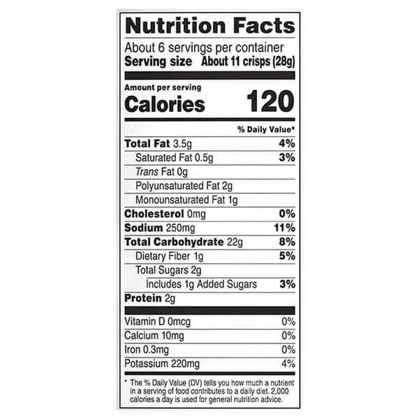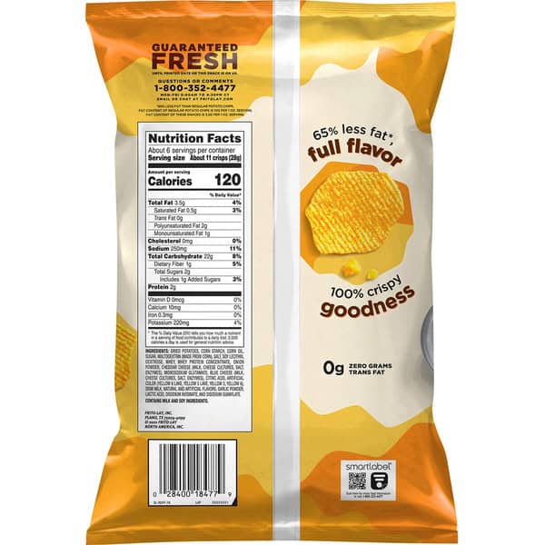 Frito-Lay’s line of Oven Baked snacks are baked, not fried, to give you the great taste you’ve come to love with Frito-Lay snacks. On top of that, RUFFLES Oven Baked Cheddar & Sour Cream Flavored Potato Crisps snacks offer 65% less fat than regular potato chips. Fat content of regular potato chips is 10g per 1 oz serving. Tat content for these snacks is 3.5g per 1 oz serving. This package contains 6.25 oz.