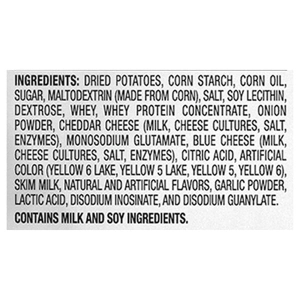 Dried Potatoes, Corn Starch, Corn Oil, Sugar, Corn Maltodextrin, And Less Than 2% Of Whey, Salt, Soy Lecithin, Cheddar Cheese (milk, Cheese Cultures, Salt, Enzymes), Whey Protein Concentrate, Potassium Salt, Onion Powder, Monosodium Glutamate, Natural And Artificial Flavors, Dextrose, Citric Acid, Sour Cream (cultured Cream, Skim Milk), Artificial Color (yellow 5 Lake, Yellow 6 Lake), Buttermilk,