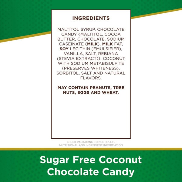Consist Of Maltitol Syrup, Chocolate Candy {maltitol, Chocolate, Cocoa Butter, Sodium Caseinate (milk), Milk Fat. Soy Lecithin (an Emulsifier), Sucralose, Natural And Artificial Flavor, Salt}, Coconut With Sodium Metabisulfite (to Promote Color Retention), Sorbitol, Salt, And Natural Flavor.