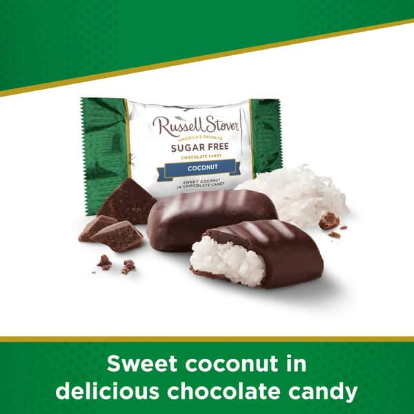 RUSSELL STOVER Sugar Free Coconut Chocolate Candy, 3 oz. bag, contains about 6 individually wrapped pieces of sweet coconut filling wrapped in delicious chocolate candy. Made with Stevia extract, a plant-based sweetener, these sweet coconutty bites deliver the sweetness you crave without any added sugar. Share them with friends and loved ones, gift them thoughtfully, or simply enjoy guilt-free snacking by filling up your candy bowl. Whether you’re at home or on the go, these zero sugar candies are the perfect pick-me-up. Since 1923, RUSSELL STOVER has been a beloved American-made classic, offering great-tasting, no-sugar-added alternatives to your favorite treats. Treat yourself to the exquisite taste of RUSSELL STOVER Sugar Free Coconut Chocolate Candy today!