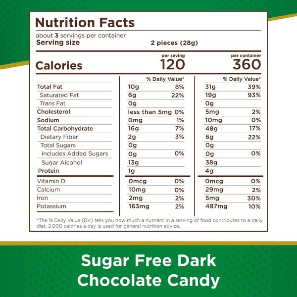 • About 6 individually wrapped zero sugar dark chocolates, made for thoughtful sharing with friends and loved ones, filling up the candy bowl for guilt-free snacking or enjoying an on-the-go sugar free treat. Product sold by weight, not volume. Contents tend to settle after packing. Information online not complete; check label of actual product being purchased.