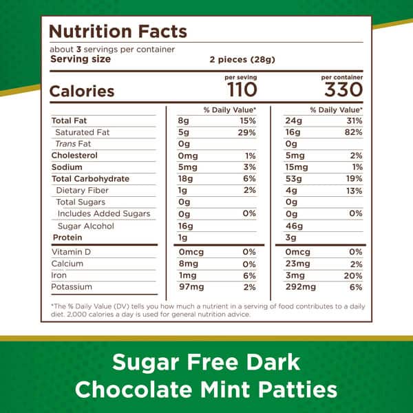 • About 6 individually wrapped zero sugar dark chocolate mint patties, made for thoughtful sharing with friends and loved ones, filling up the candy bowl for guilt-free snacking or enjoying an on-the-go sugar free treat. Product sold by weight, not volume. Contents tend to settle after packing. Information online not complete; check label of actual product being purchased.