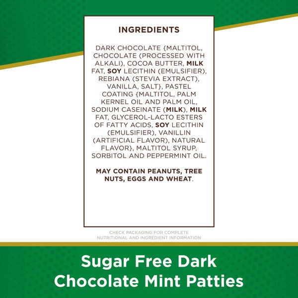 Dark Chocolate {maltitol, Chocolate (processed With Alkali), Cocoa Butter, Milk Fat, Soy Lecithin (emulsifier), Rebiana (stevia Extract), Vanilla, Salt}, Pastel Coating {maltitol, Palm Kernel Oil And Palm Oil, Sodium Caseinate (milk), Milk Fat, Glycerol-lacto Esters Of Fatty Acids, Soy Lecithin (emulsifier), Vanillin (artificial Flavor), Natural Flavor}, Maltitol Syrup, Sorbitol, Peppermint Oil