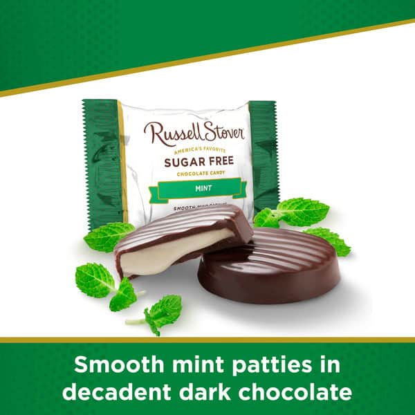 • RUSSELL STOVER Sugar Free Dark Chocolate Mint Patties, 3 oz., are made with Stevia extract, a plant-based sweetener that delivers all the sweet taste you crave with no added sugar.