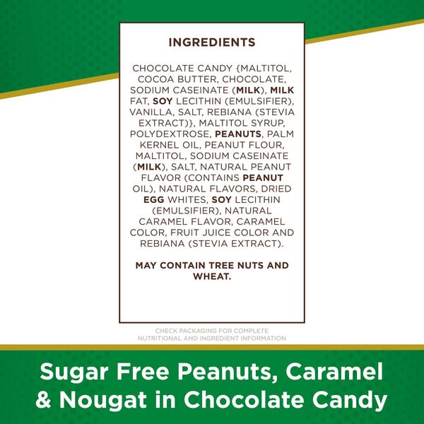 Chocolate Candy {maltitol, Cocoa Butter, Chocolate, Sodium Caseinate (milk), Milk Fat, Soy Lecithin (emulsifier), Vanilla, Salt, Rebiana (stevia Extract)}, Maltitol Syrup, Polydextrose, Peanuts, Palm Kernel Oil, Peanut Flour, Maltitol, Sodium Caseinate (milk), Salt, Natural Peanut Flavor (contains Peanut Oil), Natural Flavors, Dried Egg Whites, Soy Lecithin (emulsifier), Natural Caramel Flavor, Caramel Color, Fruit Juice Color, Rebiana (stevia Extract)