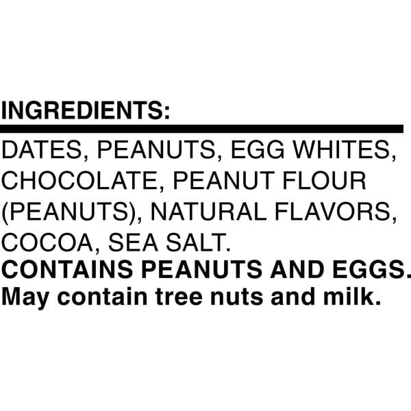 Dates, Peanuts, Egg Whites, Chocolate, Peanut Flour, (peanuts), Natural Flavors, Cocoa Sea Sait