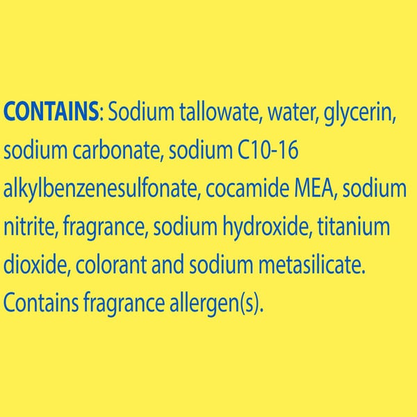 Sodium Tallowate, Water, Glycerin, Sodium Carbonate, Sodium C10-16 Alkylbenzenesulfonate, Cocamide Mea, Sodium Nitrite, Fatty Acids, C12-20 And C12-20-unsatd, Compds. With Ethanolamine, Fragrance, Sodium Hydroxide, Titanium Dioxide, Propylene Glycol, Colorant, Sodium Metasilicate